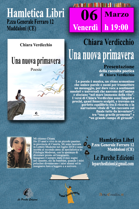 Venerdì 6 marzo, alle 19,00, presentazione della raccolta poetica di Chiara Verdicchio "Una nuova primavera" alla libreria Hamletica libri di Maddaloni (CE), piazza Generale Ferraro 12.